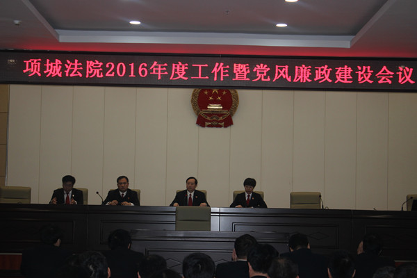 4月5日上午,项城法院在二楼大审判庭召开2016年度法院工作暨党风廉政建设工作会议。院党组全体成员及全院干警参加了会议,会议由党组副书记解普建主持。