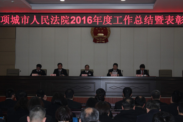 1月13日上午,项城法院召开2016年度工作总结暨表彰大会,院党组书记、院长赵振勇及党组全体成员、全体干警参加了会议。会议由党组成员、副院长韩伟主持。