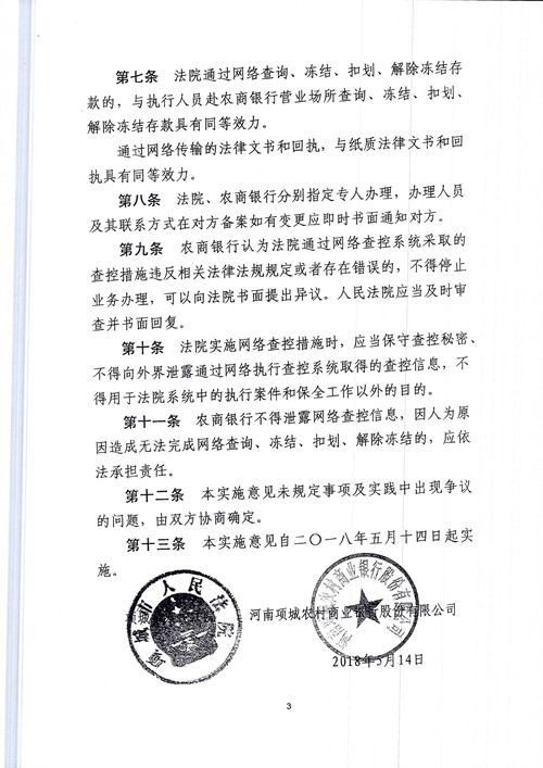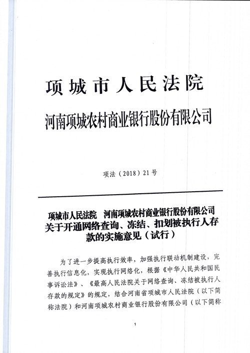 项城市人民法院 河南项城农村商业银行股份有限公司 关于开通网络查询、冻结、扣划被执行人存款的实施意见(试行)