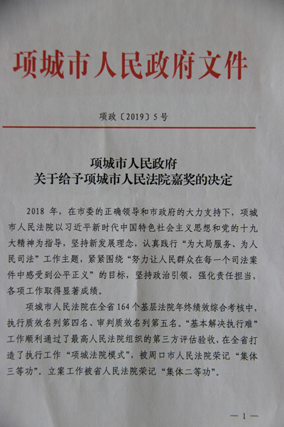 项城法院因2018年度工作成绩突出,受到项城市人民政府的通令嘉奖,是法检公司四家唯一受到政府通令嘉奖的的单位,并被表彰为“项城市平安建设工作先进集体”。院政治部、立案庭等四个部门荣获“项城市人民满意的政法单位”荣誉称号,政治部主任兼研究室主任耿贺华、执行局局长吴玉东等6名同志荣获“项城市人民满意的的政法干警” 荣誉称号,刑事审判庭庭长龚光明荣获“项城市平安建设工作先进个人”荣誉称号。
