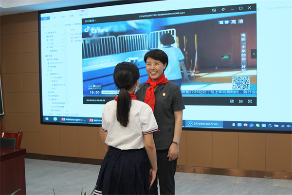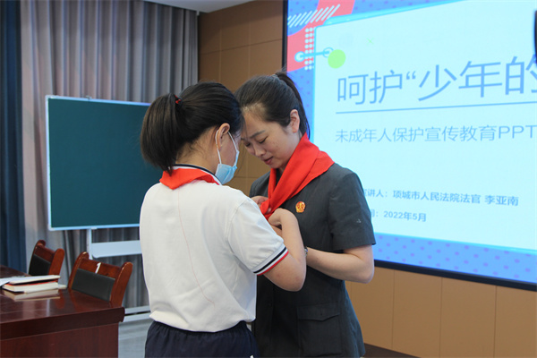 随后,项城法院少年审判团队法官李娅南走进教室,以《呵护少年的你》为题,以案释法讲解了法律与未成年人之间的密切关系,提醒未成年人要增强防范意识和自我保护能力,倡导未成年人要树立正确的世界观、人生观和价值观,赢得了师生的一致好评。小学生走上讲台为王燕副院长、李娅南法官系上红领巾,王院长一行还为听课的小学生赠送了书包。