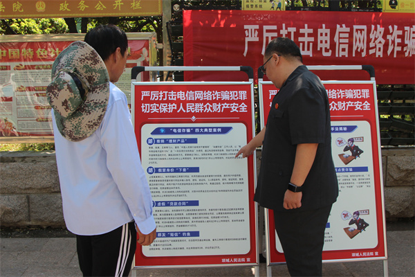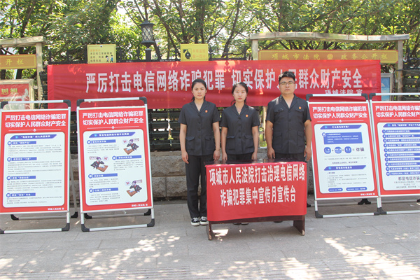 在项城法院大门口南侧,干警们通过悬挂宣传条幅、摆放宣传展板、设置宣传台的形式,为过往群众提供法律咨询,讲解电信网络诈骗的手段、如何防范电信网络诈骗,用真实的案例警示群众提高防范意识。干警们还叮嘱群众,提醒自己的父母、亲戚、邻居注意防范电信网络诈骗。