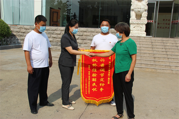 7月1日下午,9名农民工代表童某某来到项城法院,将一面书写“诉前调解定纷争 枫桥经验解民忧”字样的锦旗赠送到项城法院丁集法庭书记员刘清戈和驻庭特邀调解员孙占军、郭振鹏手中,以表达他们的谢意。
