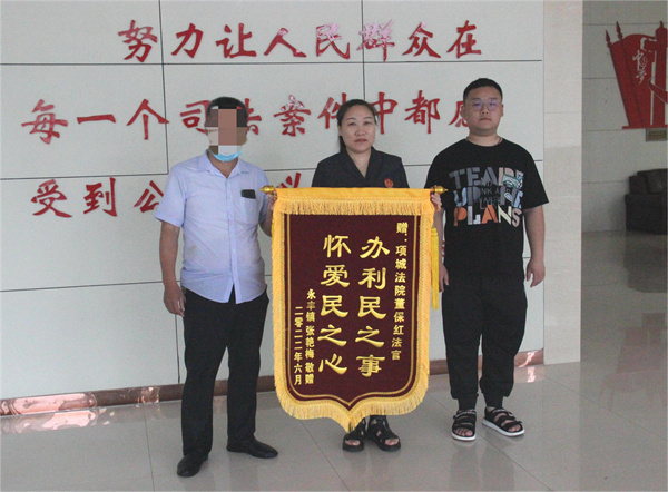 7月5日上午,远在江苏的原告张某某委托其代理人张景红律师来到项城法院,将一面锦旗赠送到项城法院官会人民法庭庭长董保红手中,以表达他的谢意。