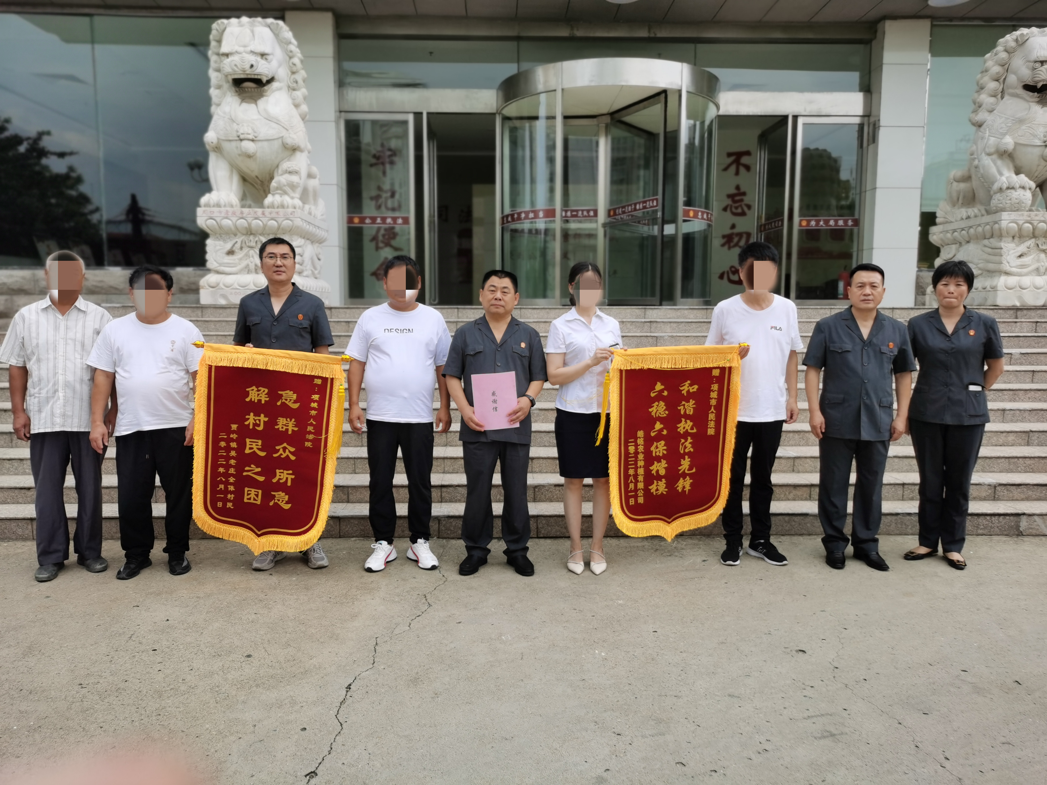 8月1日上午,项城市贾岭镇某村民委员会代表、项城市某种植有限公司工作人员一行5人来到项城法院,将两面写着“急群众所急 解村民之困”、“和谐执法先锋 六保六稳楷模”的锦旗和一封申请执行人、被执行人、第三方联名书写的感谢信送到项城法院党组副书记、副院长朱仲文,执行局干警刘东祥、刘璟手中,以表示他们的诚挚谢意。