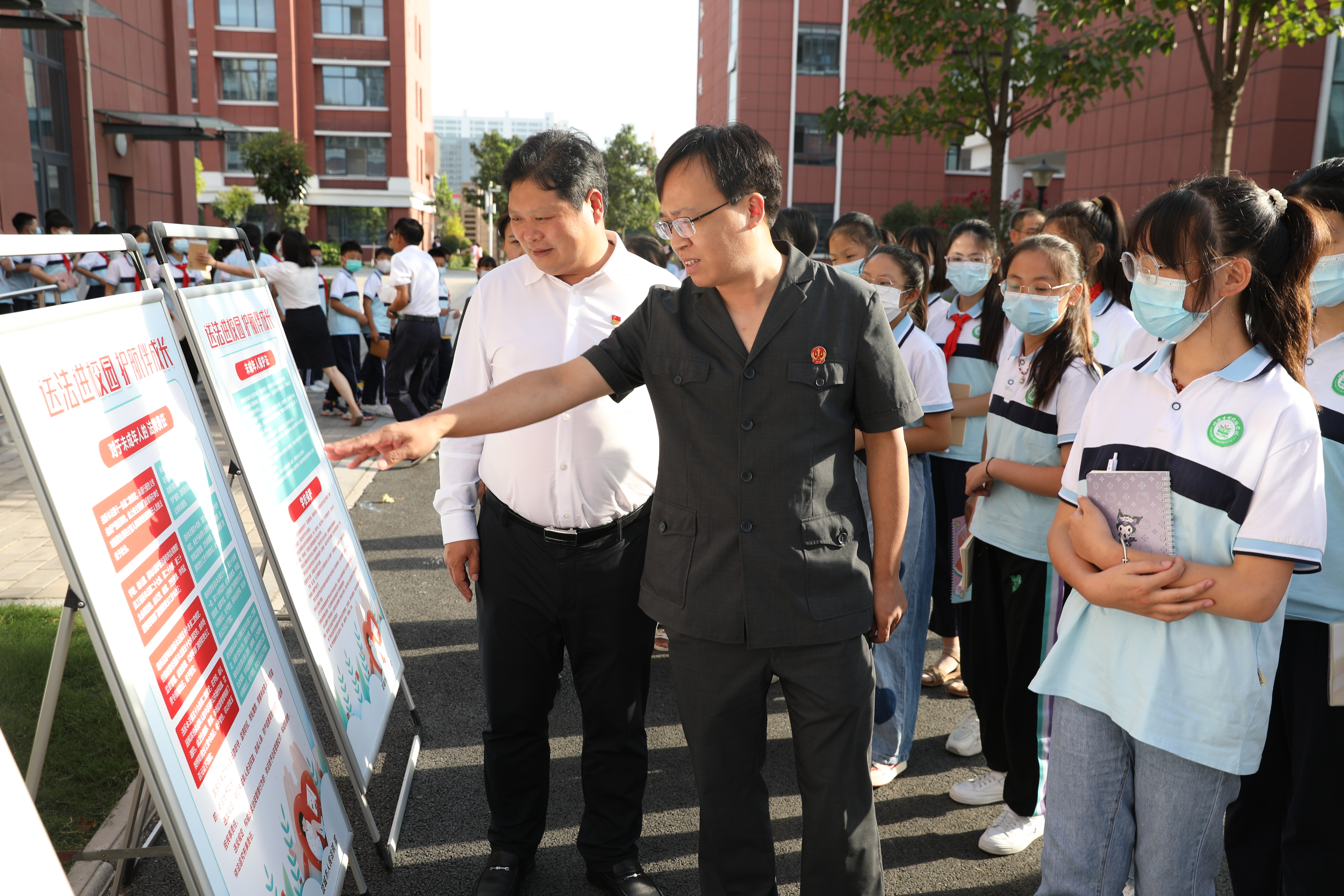 讲座结束后,朱新章院长一行带领师生参观了法院法治项城展板,结合展板内容,就未成年人保护法、预防校园欺凌、电信诈骗等知识进行讲解。