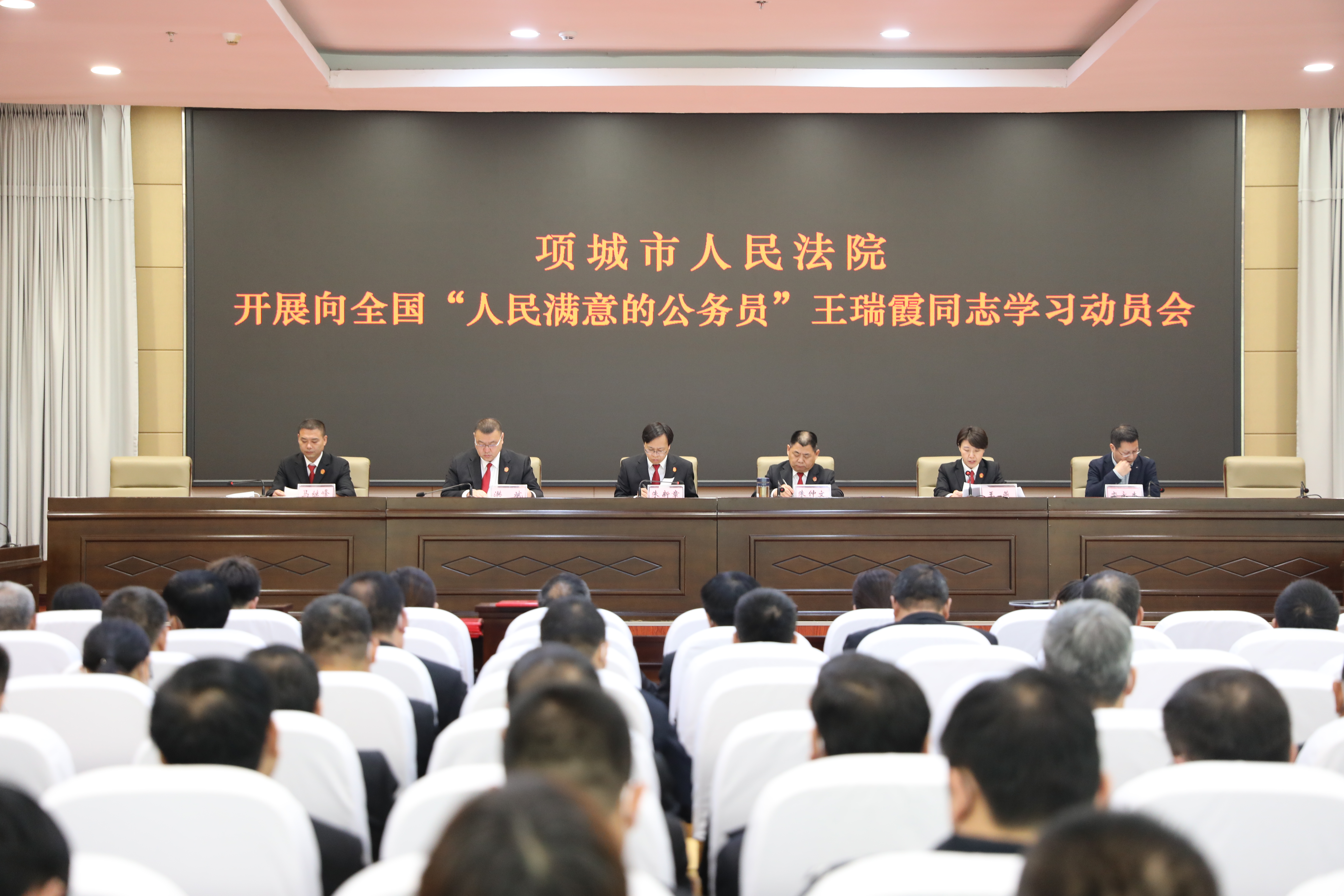 为充分发挥先进典型的示范带动作用,激励全院干警忠诚干净担当,积极践行司法为民宗旨,9月30日下午,项城法院召开了向全国“人民满意的公务员”王瑞霞同志学习动员会,院党组书记、院长朱新章,班子成员,市纪委监委派驻监察组组长栾永杰及全体干警参加会议。