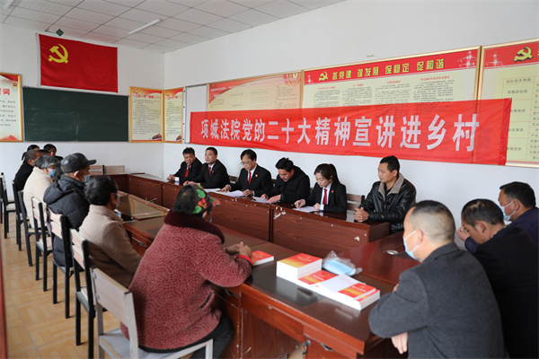为深入学习宣传贯彻党的二十大精神,让党的二十大精神走进基层干部和群众心中,3月24日上午,项城法院党组书记、院长朱新章带领院党的二十大精神宣讲组,到法院派驻“第一书记”村、项城市李寨镇项营行政村开展党的二十大精神宣讲活动,李寨镇党委副书记刘强等陪同。