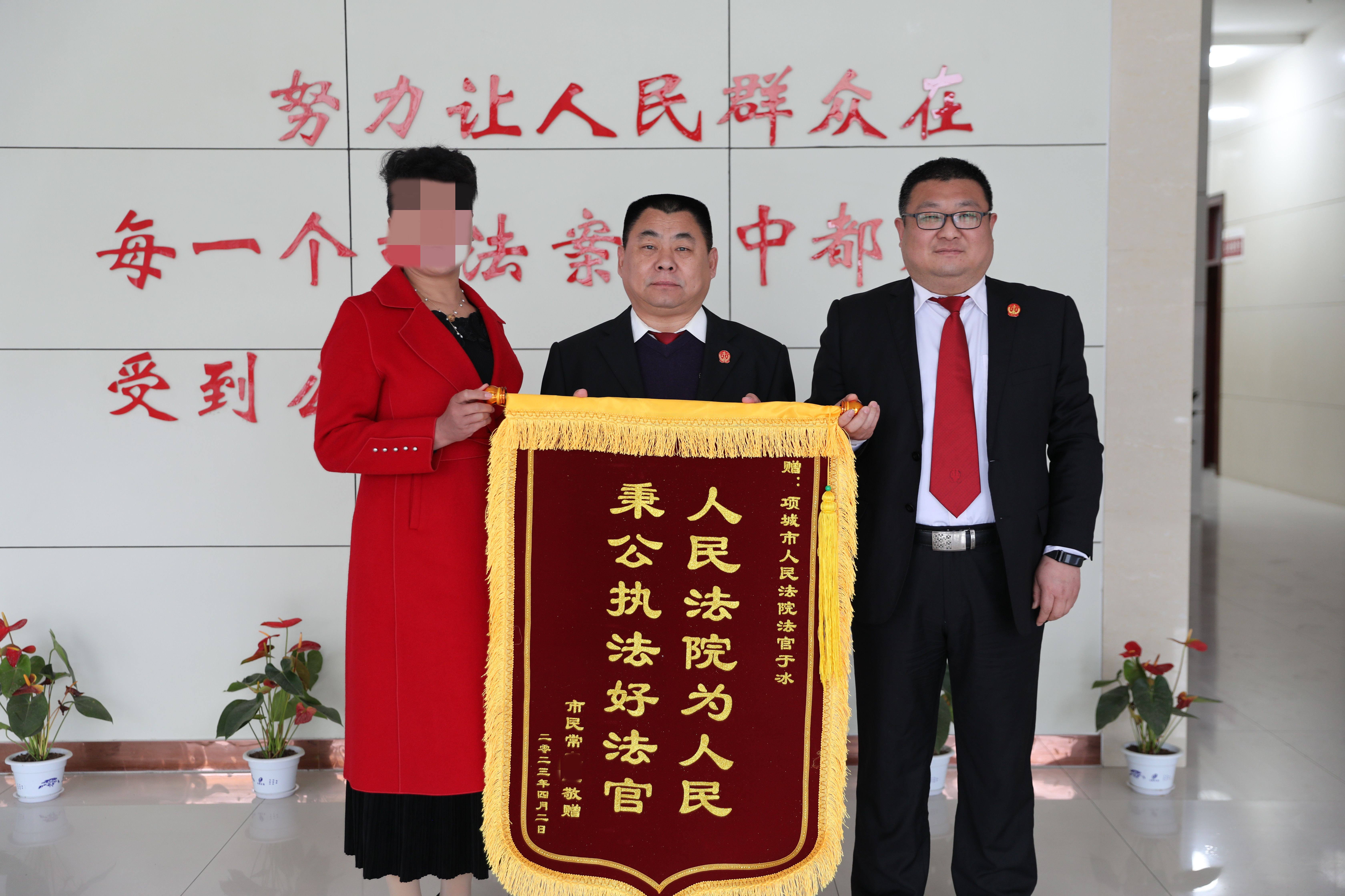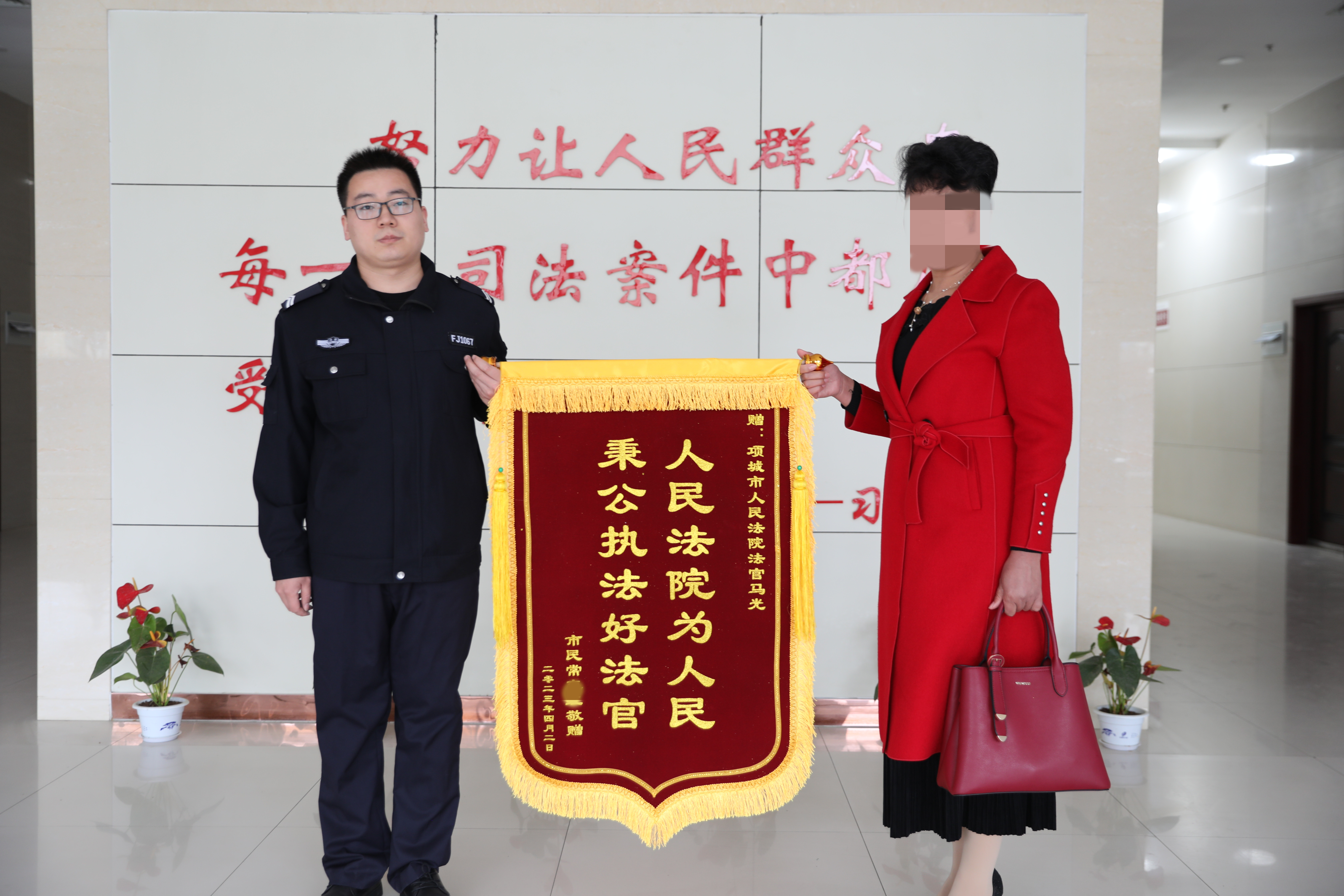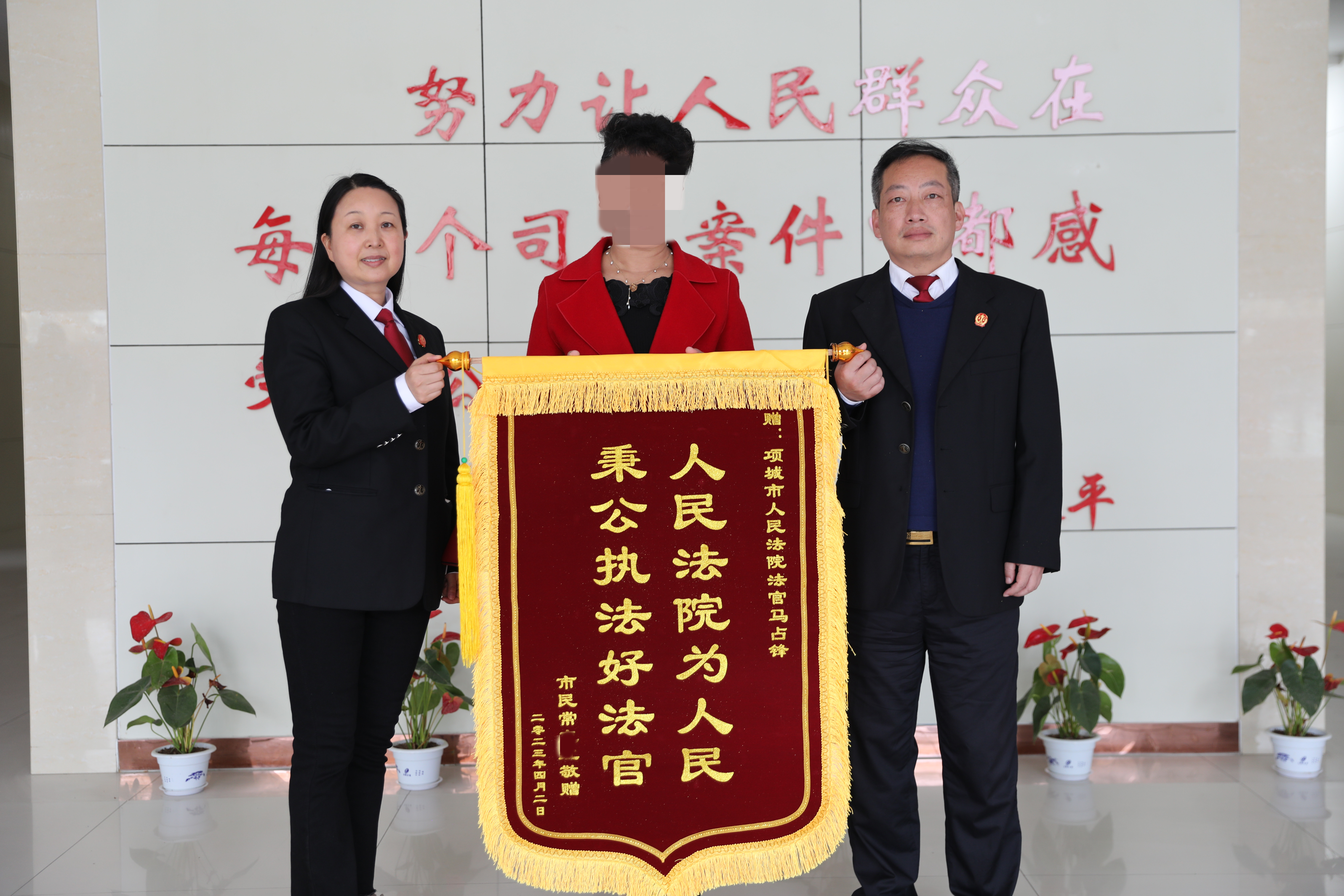 4月3日上午,当事人常某某冒雨来到项城法院将三面写着“人民法院为人民 秉公执法好法官”的锦旗分别送到案件审理执行法官手中,对法官公正高效办理案件表示感谢。