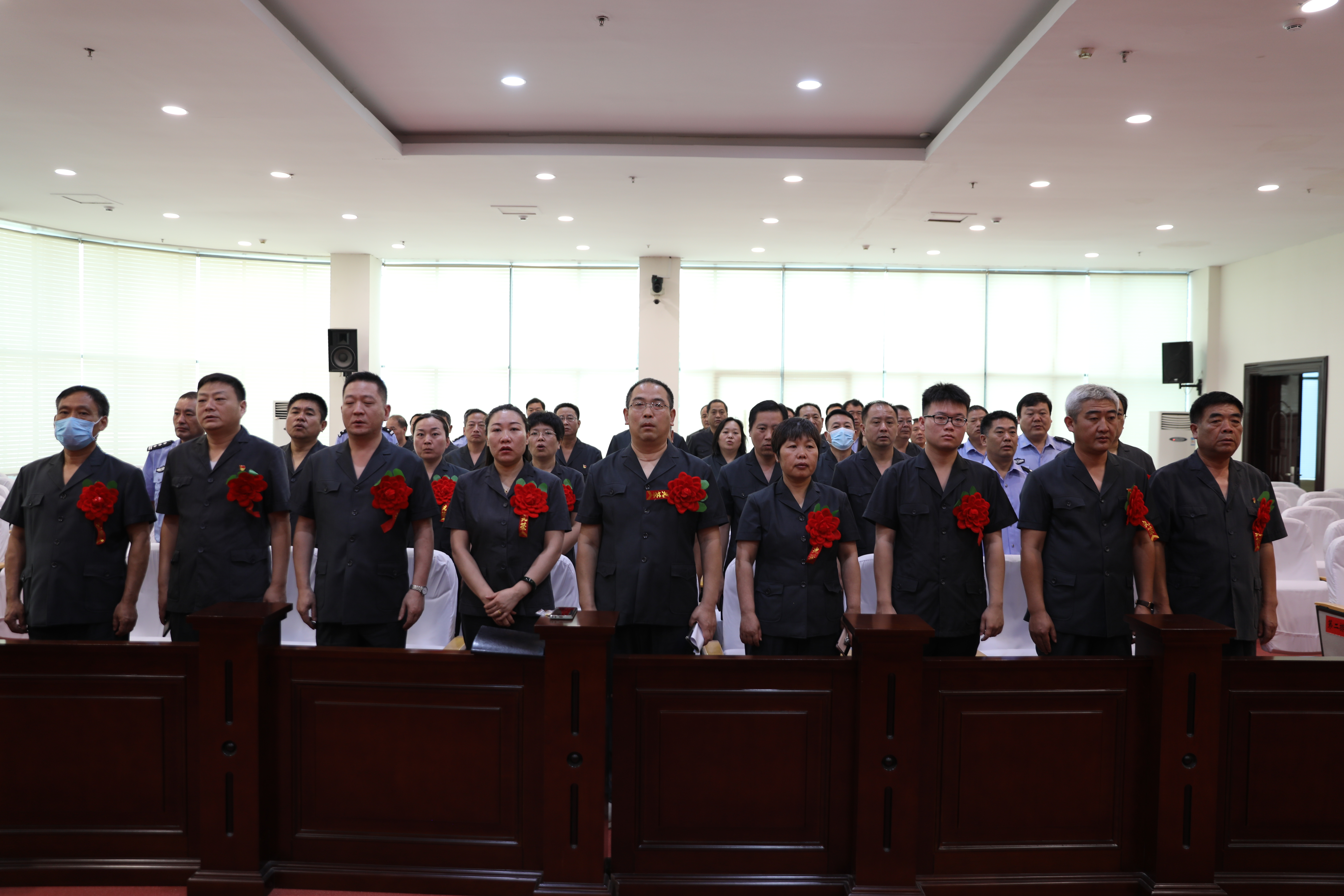 大会在庄严的国歌声中拉开帷幕,全体起立,奏唱国歌。