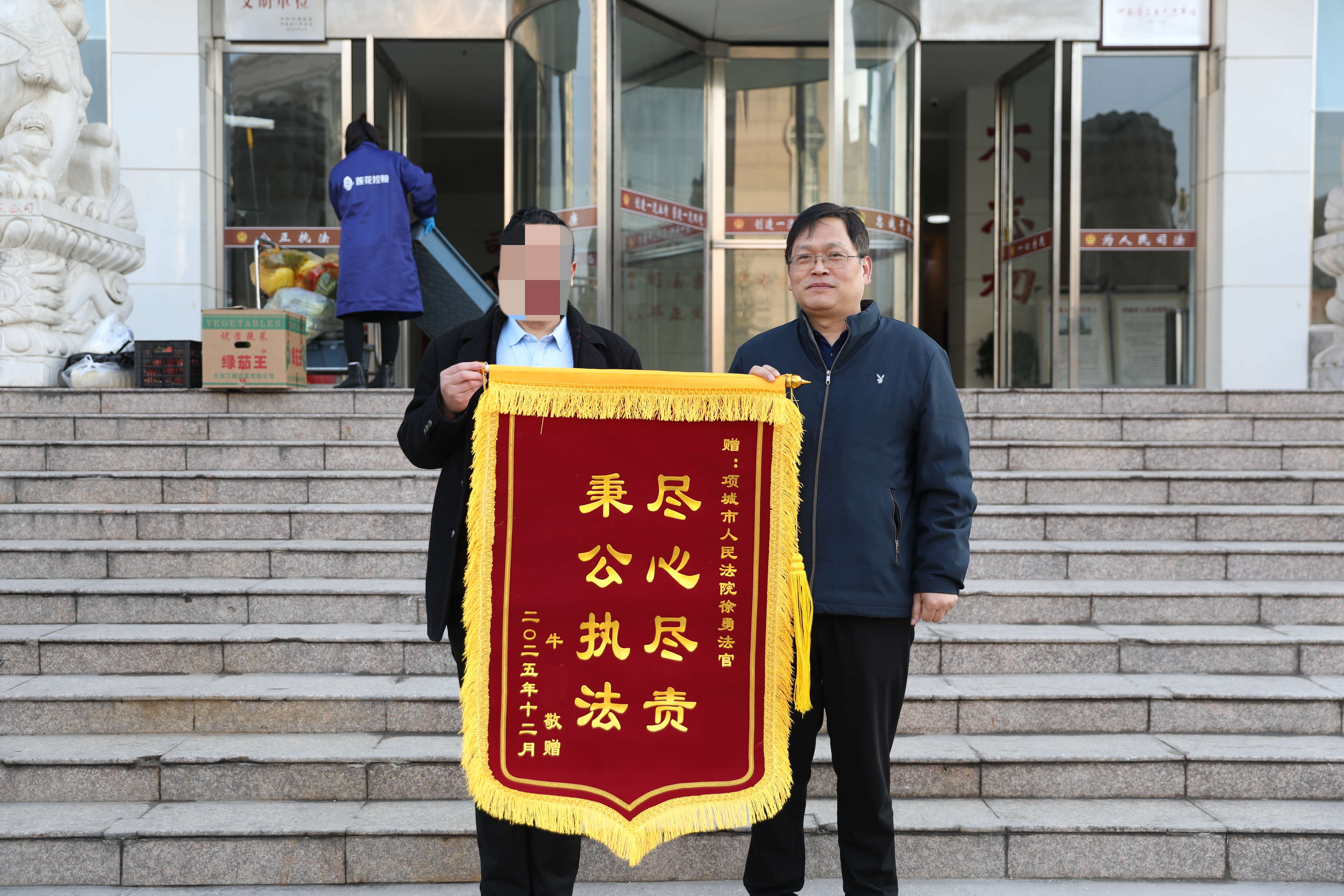 “徐法官, 谢谢你,真的太感谢了!”12月16日,申请人牛某某紧紧握着项城法院执行干警徐勇的手,激动之情溢于言表,随即将一面印着“尽心尽责 秉公执法”的锦旗送到徐勇手中,以此表达对法院高效执行、维护其合法权益的感激之情。