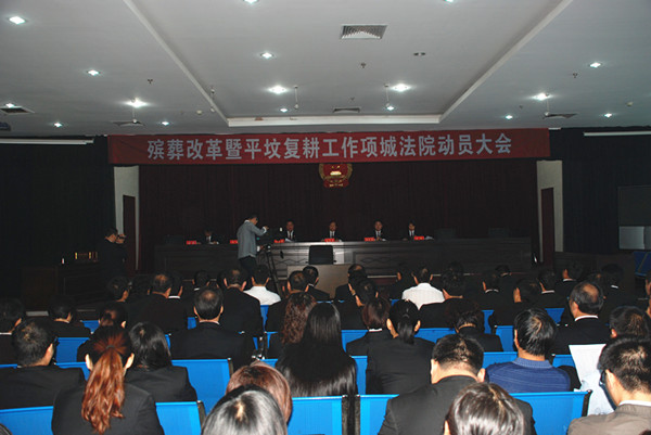 10月15日上午,项城市法院召开殡葬改革暨平坟复耕工作动员大会,院党组书记、院长赵振勇,党组副书记徐如明,副院长位红星、韩伟,纪检组长王燕,院长助理陈东出席了会议,市法院全体干警参加了会议。